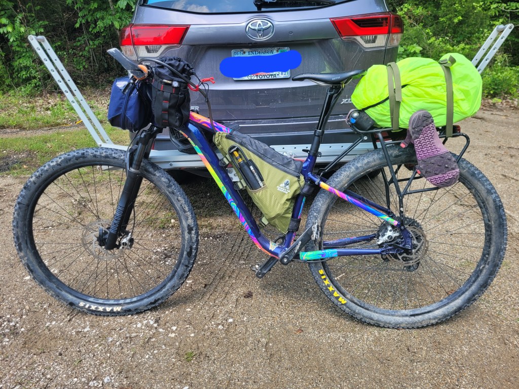 Kona Mahona hardtail mtb used on Cohutta Cat route through Blue Ridge, GA and on the Tiptokaworth Ridge route (see below) in June with ample resupply stops and dispersed camping. This is my primary bikepacking set up due to the versatility and easy gearing (to manage lots of climbing and weight of gear).
