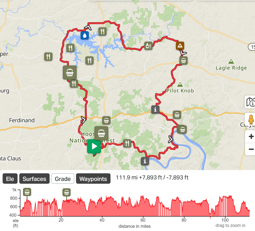 240 mile lollipop loop (option to shorten), 7.7k elevation, 75% paved along Tunnel Hill trail