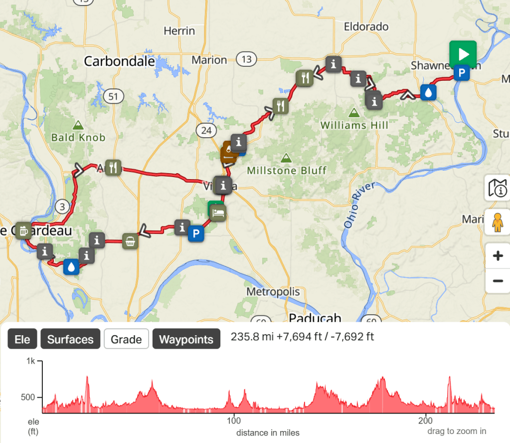 May 29, 30, 31 (out and back across southern IL) So ILL 3 day route, 240 miles, 7.7k elevation