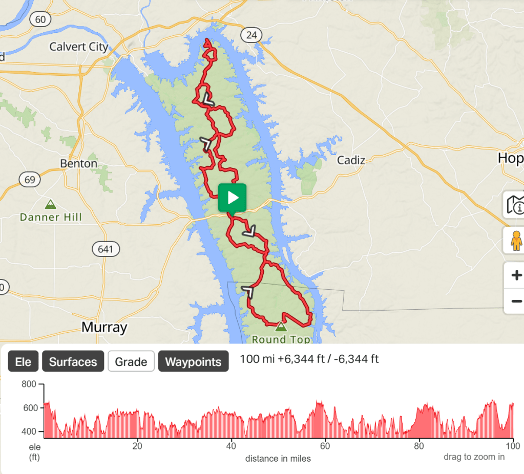 June 27, 28 (Land between the Lakes, KY) Fruit Loops route, 100 miles, 6.3k elevation