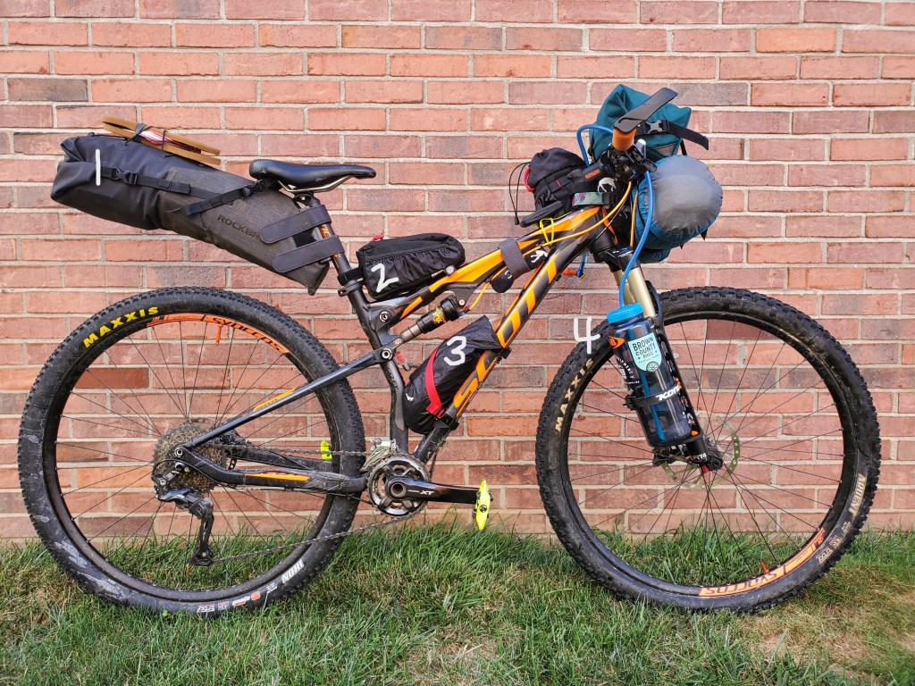 Full suspension Scott mtb used during the TNGA (trans north Georgia race) in August. 350 miles, 50k elevation, all terrain types, resupply every 70 miles, sleeping in established campgrounds.